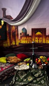 С самого утра офис преобразился. В одном из пространств появилась восточная фотозона: ковры, рассыпанные подушки, низкий столик, орехи, сладости и горячий чай с ароматом специй. Мужчинам предложили на время сменить роль — представить себя султанами, хозяевами положения, неспешно принимающими почести.